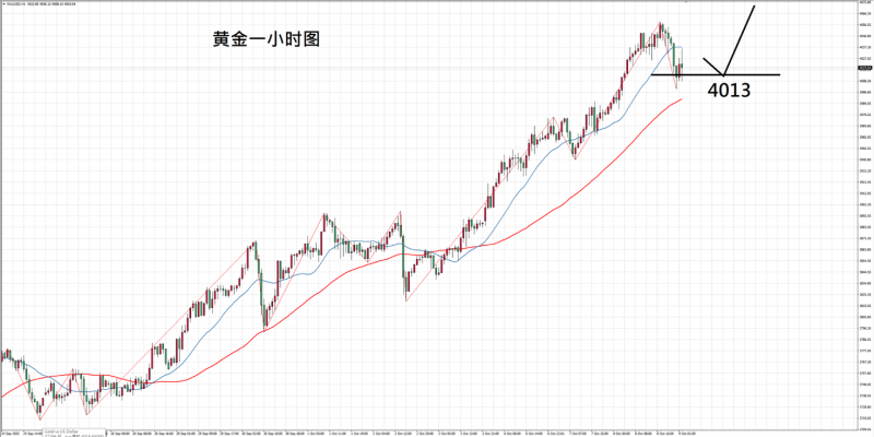 黄金一小时图,走势相对高低点上移,趋势仍以偏多为主;如后续回落未再刷新低点,走势可能重新反弹,故建议短多操作。